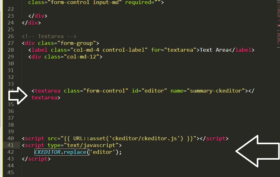 <textarea class=”form-control” id=”editor” name=”summary-ckeditor”></textarea>