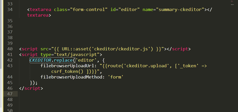 <script src=”{{ URL::asset(‘ckeditor/ckeditor.js’) }}”></script>
